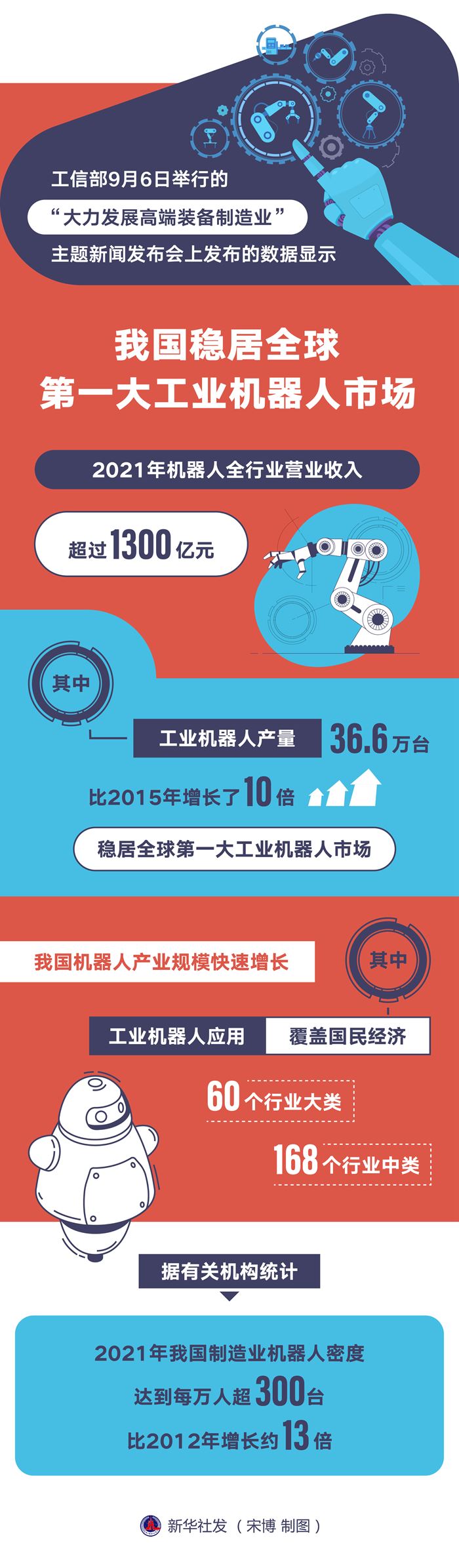 工信部裝備工業(yè)一司副司長郭守剛6日表示,我國機器人產(chǎn)業(yè)規(guī)??焖僭鲩L,2021年機器人全行業(yè)營業(yè)收入超過1300億元。其中,工業(yè)機器人產(chǎn)量達36.6萬臺,比2015年增長了10倍,穩(wěn)居全球第一大工業(yè)機器人市場。