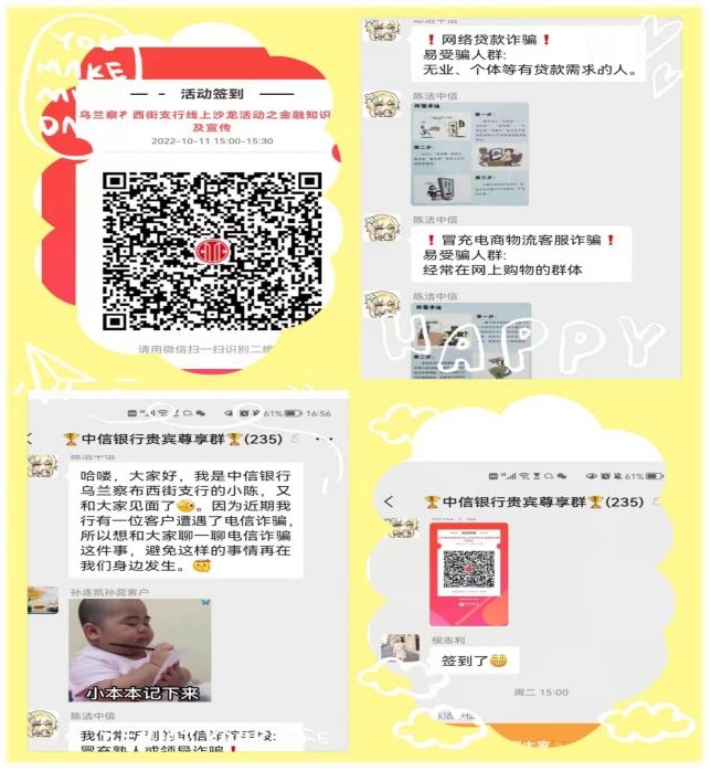 該行各網(wǎng)點(diǎn)組織開展“防范電信詐騙——中信銀行守護(hù)您的金融安全”主題線上沙龍活動(dòng),300余人積極參與,進(jìn)一步提高公眾金融素養(yǎng)。同時(shí),該行充分利用線上宣傳渠道,通過專業(yè)人員講解、互動(dòng)提問答題、電子宣傳手冊(cè)等方式,向社會(huì)公眾宣傳電信詐騙知識(shí)。并對(duì)學(xué)生、老年人等易受騙群體進(jìn)行針對(duì)性反詐警示教育,揭露電信詐騙犯罪手法和危害,以及教授如何識(shí)別、如何應(yīng)對(duì)、防止上當(dāng)受騙等方法。