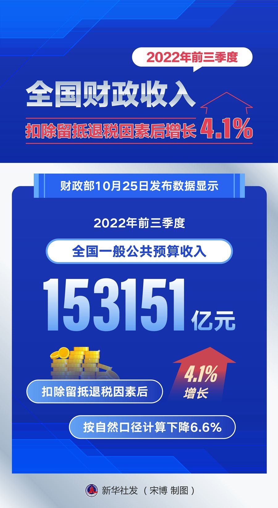 財政部25日發(fā)布數(shù)據(jù)顯示,今年前三季度,全國一般公共預(yù)算收入153151億元,扣除留抵退稅因素后增長4.1%,按自然口徑計算下降6.6%。
