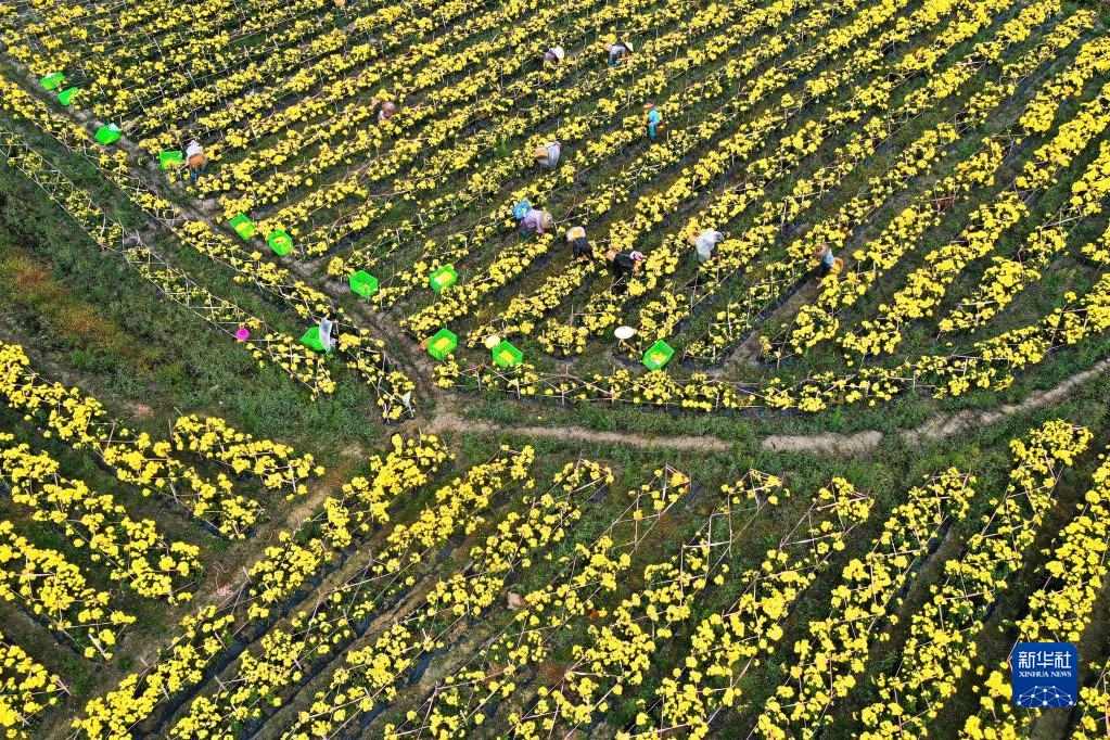 10月21日,村民在貴州省貴定縣云霧鎮(zhèn)菊花種植基地采摘金絲皇菊(無人機照片)。新華社記者 楊文斌 攝