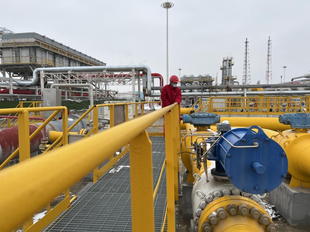 呼圖壁儲氣庫采氣現(xiàn)場,工作人員正在巡檢。(新華社發(fā))