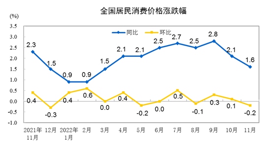 國家統(tǒng)計局今日發(fā)布數(shù)據(jù)顯示,2022年11月份,全國居民消費價格同比上漲1.6%。其中,城市上漲1.5%,農(nóng)村上漲1.7%;食品價格上漲3.7%,非食品價格上漲1.1%;消費品價格上漲2.3%,服務(wù)價格上漲0.5%。1-11月平均,全國居民消費價格比上年同期上漲2.0%。