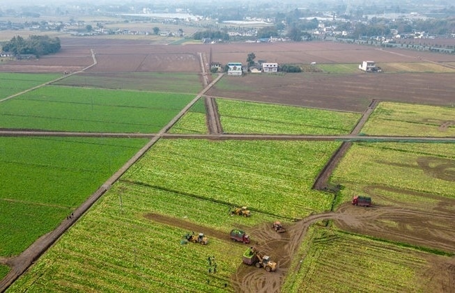 2月9日,四川省眉山市公義鎮(zhèn)欣榮村的村民們正用大型機械搶收青菜。翁光建攝