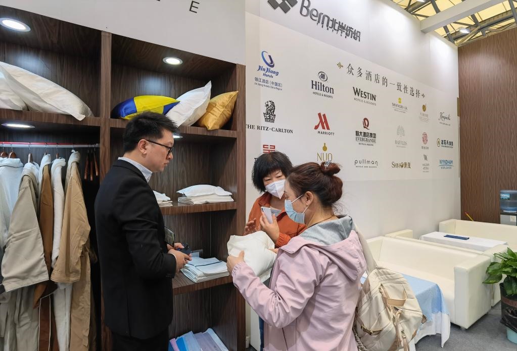 3月28日,觀眾在展會(huì)上詢(xún)問(wèn)布草用品。新華社記者 陳愛(ài)平 攝
