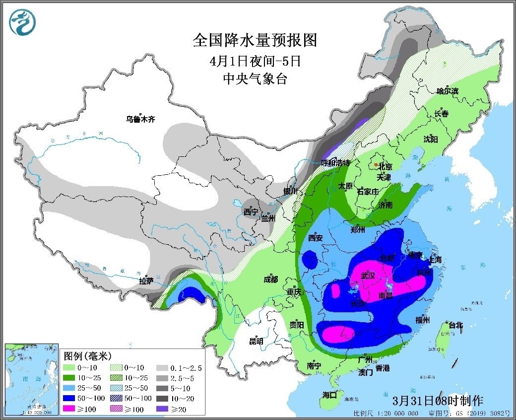 4月1日夜間至5日,甘肅東部、寧夏、河北北部和內(nèi)蒙古中東部等地有中到大雪或雨夾雪,內(nèi)蒙古中部等地局地暴雪或大暴雪,主要降雪時(shí)段為2日至3日;西北地區(qū)東南部、西南地區(qū)東部、江漢、江淮、江南、華南以及黃淮等地有中到大雨,其中河南東南部、湖北東部、湖南、安徽、江西、浙江西部、廣西北部、廣東北部和福建西部等地的部分地區(qū)有暴雨,局地大暴雨;主要降水時(shí)段為2日至4日。上述地區(qū)累計(jì)降水量20-50毫米,部分地區(qū)有70-120毫米,局地可達(dá)160毫米;100毫米以上降雨覆蓋面積達(dá)23萬平方公里。江淮及以南地區(qū)伴有短時(shí)強(qiáng)降水、雷暴大風(fēng)或冰雹等強(qiáng)對流天氣,最大小時(shí)降水量30-60毫米;江南北部、江漢東部、江淮等地伴有10級以上雷暴大風(fēng)。