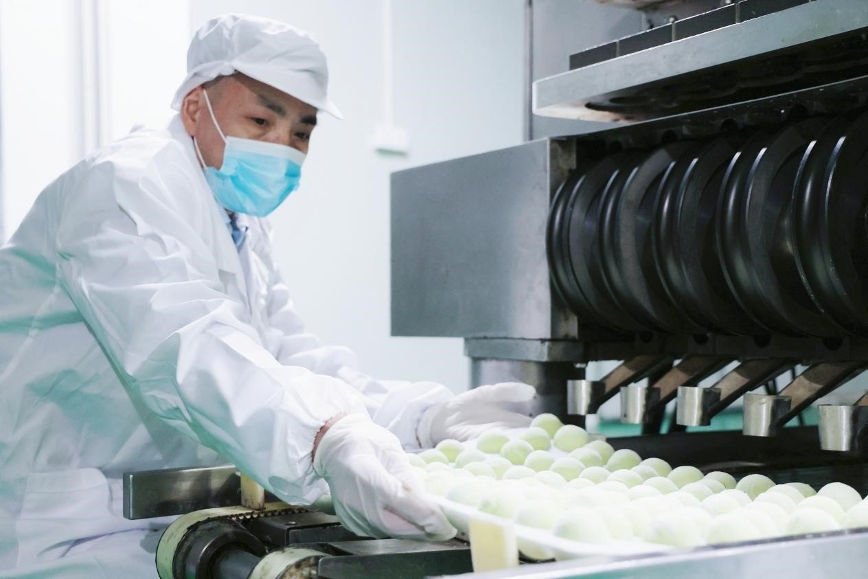 一大早,位于江蘇省無錫市濱湖區(qū)胡埭鎮(zhèn)的食品生產(chǎn)車間,4臺大型和面機不停運轉(zhuǎn),工人們忙著制作的正是當(dāng)?shù)氐奶厣鄨F(tuán)。