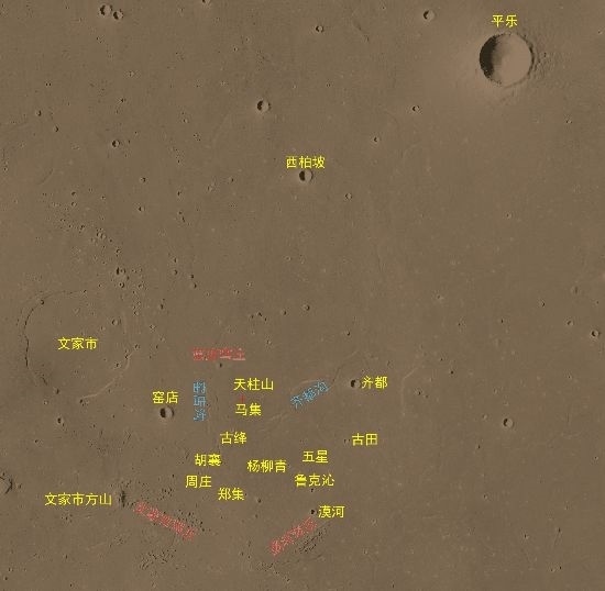 科學(xué)研究團隊通過火星高分影像,識別了著陸點附近大量的地理實體,國際天文聯(lián)合會根據(jù)相關(guān)規(guī)則,將其中的22個地理實體,以中國人口數(shù)小于10萬的歷史文化名村名鎮(zhèn)加以命名。將中國標(biāo)識永久刻印在火星大地。