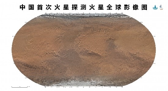 天問一號任務(wù)環(huán)繞器中分辨率相機,于2021年11月至2022年7月歷時8個月,實施了284軌次遙感成像,對火星表面實現(xiàn)了全球覆蓋。地面應(yīng)用系統(tǒng)對獲取的14757幅影像數(shù)據(jù)進行處理后得到火星全球彩色影像圖。
