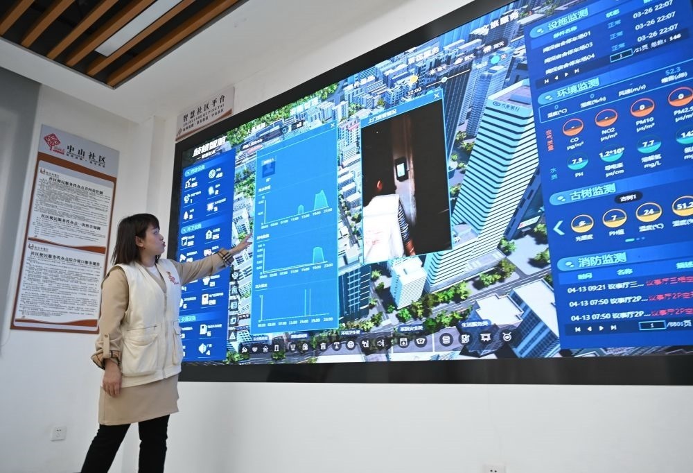 福州市鼓樓區(qū)是國家智能社會治理綜合實驗基地,社區(qū)工作者林英在鼓樓區(qū)鼓東街道中山社區(qū)介紹“智慧社區(qū)”建設(shè)提升基層治理能力情況(4月25日攝)。新華社記者 林善傳 攝