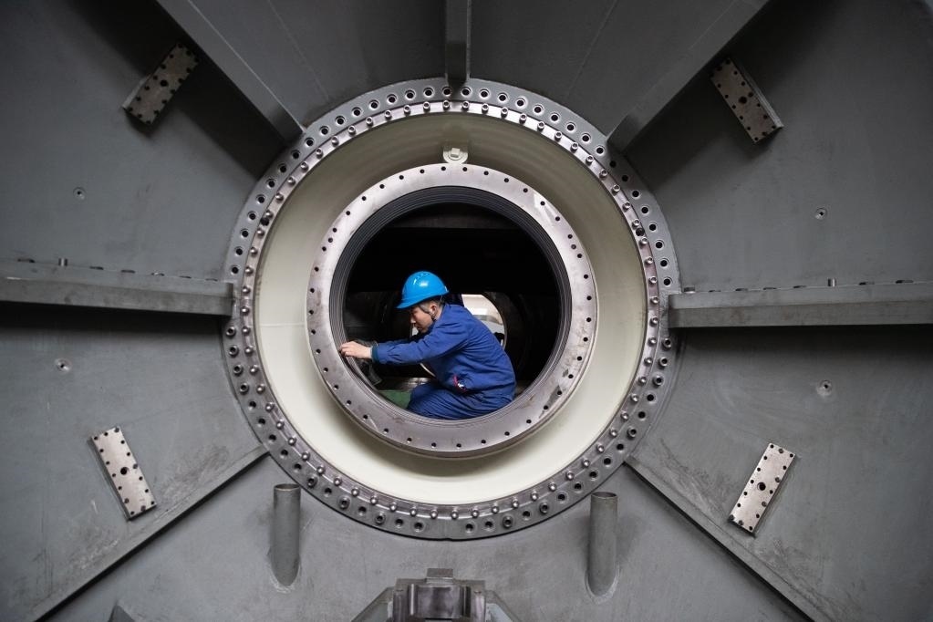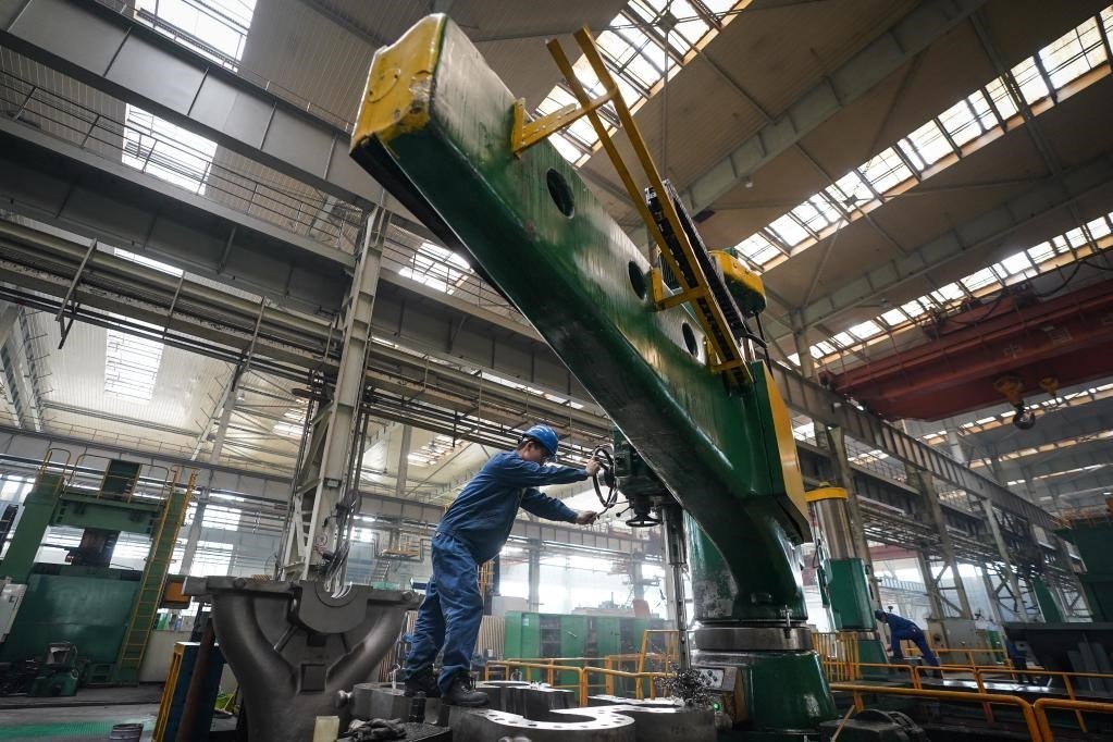 4月28日,工人在哈電集團哈爾濱汽輪機廠有限責任公司車間內生產作業(yè)。新華社記者 張濤 攝