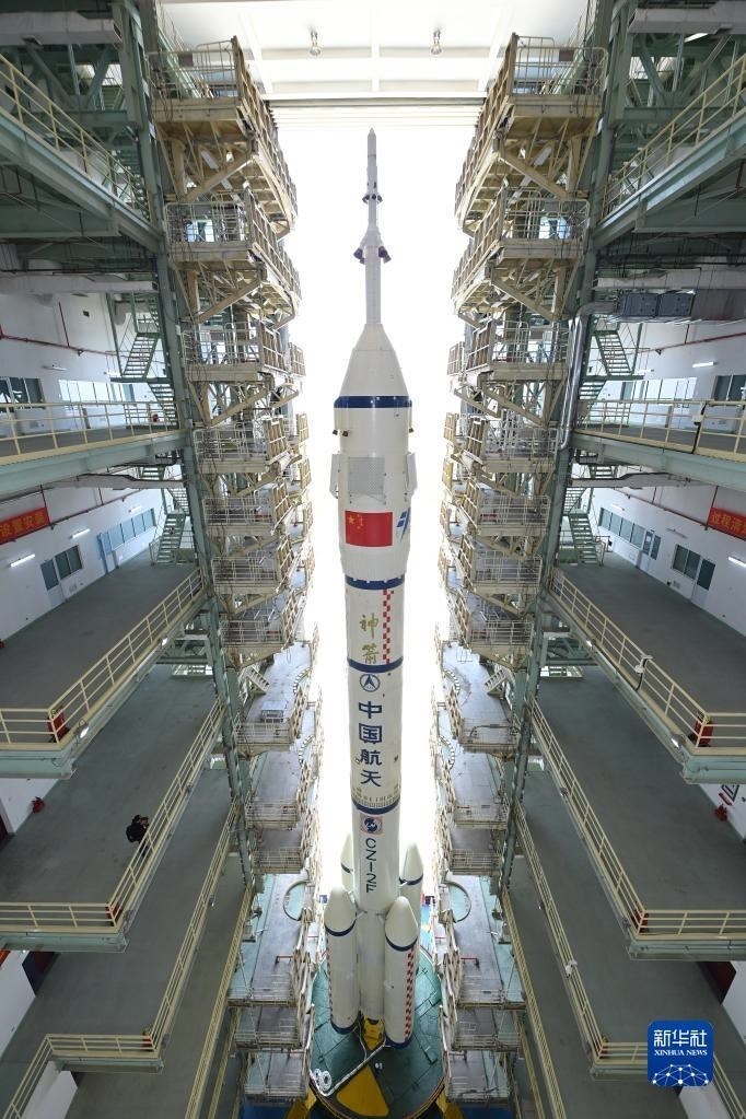 5月22日,神舟十六號(hào)載人飛船與長(zhǎng)征二號(hào)F遙十六運(yùn)載火箭組合體轉(zhuǎn)運(yùn)至發(fā)射塔架。新華社發(fā)(汪江波 攝)