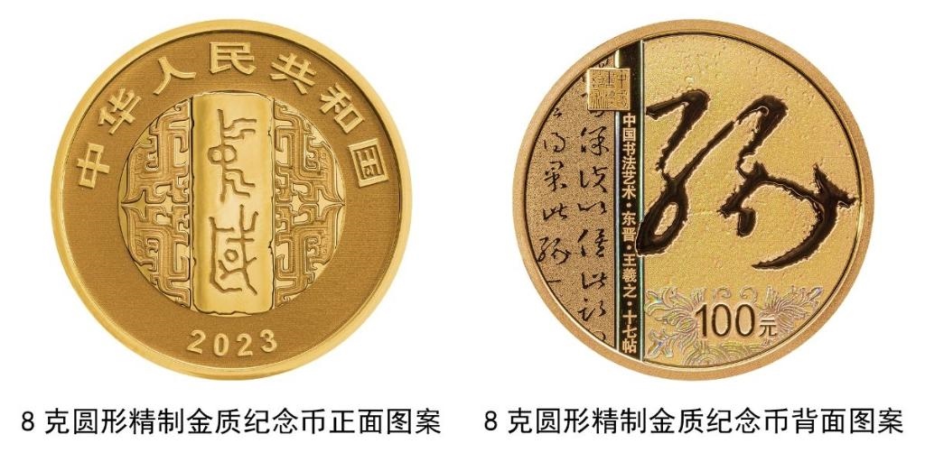 8克圓形金質(zhì)紀念幣背面圖案為東晉王羲之書《十七帖》局部文字及“緣”字樣與裝飾紋樣、“中國書法藝術(shù)”篆刻鈐印等組合設(shè)計,并刊“中國書法藝術(shù)·東晉·王羲之·十七帖”字樣及面額。