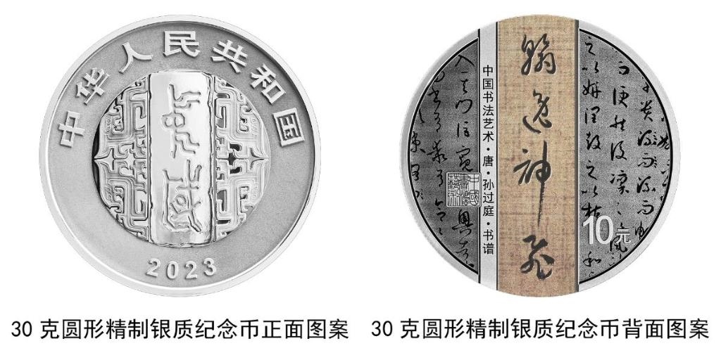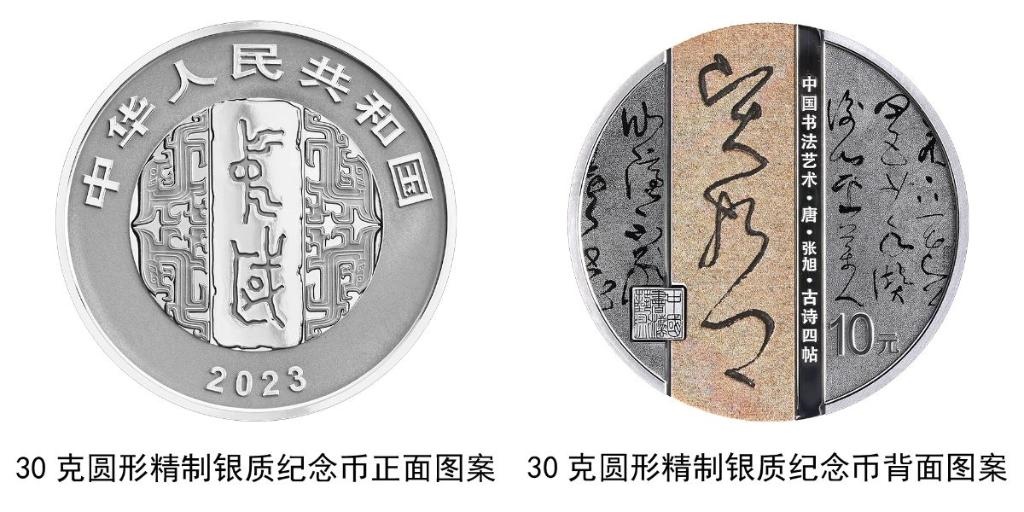 30克圓形銀質(zhì)紀念幣背面圖案為唐代張旭書《古詩四帖》局部文字及“賢哲”字樣與“中國書法藝術(shù)”篆刻鈐印等組合設(shè)計,并刊“中國書法藝術(shù)·唐·張旭·古詩四帖”字樣及面額。