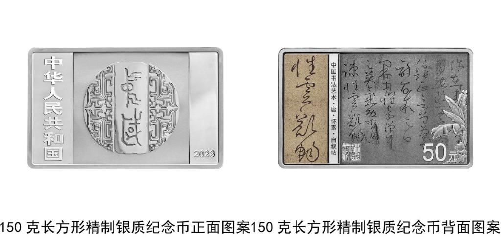 150克長方形銀質(zhì)紀念幣背面圖案為唐代懷素書《自敘帖》局部文字及“性靈豁暢”字樣與芭蕉、石頭、“中國書法藝術(shù)”篆刻鈐印等組合設(shè)計,并刊“中國書法藝術(shù)·唐·懷素·自敘帖”字樣及面額。