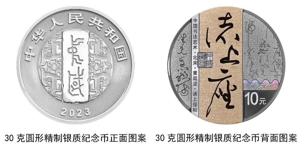 30克圓形銀質(zhì)紀念幣背面圖案為北宋黃庭堅書《諸上座帖》局部文字及“諸上座”字樣與筆架、“中國書法藝術(shù)”篆刻鈐印等組合設(shè)計,并刊“中國書法藝術(shù)·北宋·黃庭堅·諸上座帖”字樣及面額。