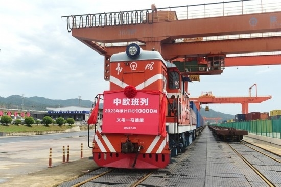 7月29日,隨著滿載110個標箱出口貨物的X8020次中歐班列從鐵路義烏西站緩緩開出前往西班牙馬德里,2023年中歐班列累計開行已達1萬列,較去年提前22天破萬列;發(fā)送貨物108.3萬標準箱,同比增長27%。