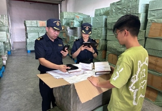 周華偉和搭檔一起對出口貨物進行查驗。受訪者供圖