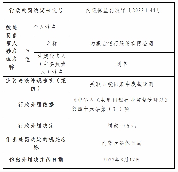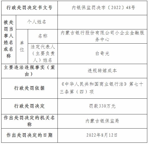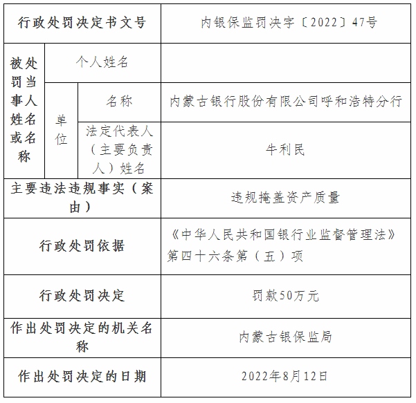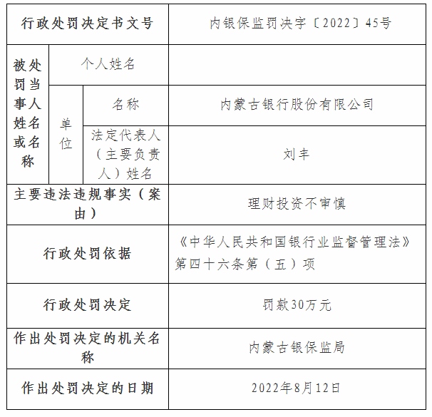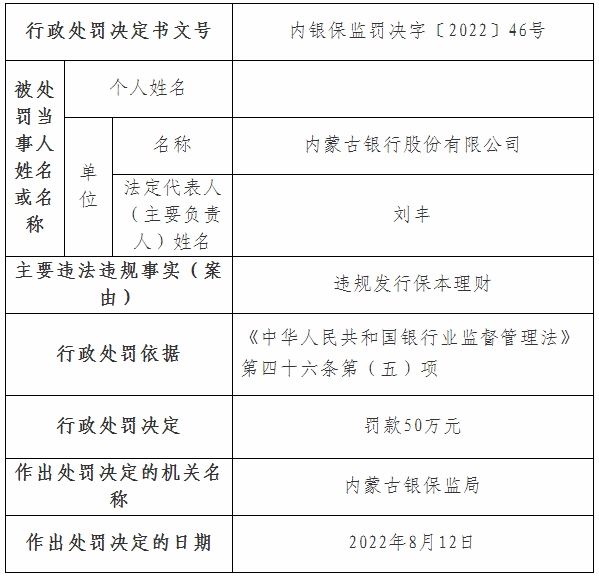 其中內銀保監(jiān)罰決字〔2022〕44號、45號、46號行政處罰信息公開表顯示,內蒙古銀行因關聯(lián)方授信集中度超比例、理財投資不審慎、違規(guī)發(fā)行保本理財,分別被罰款50萬元、30萬元、50萬元;內銀保監(jiān)罰決字〔2022〕47號行政處罰信息公開表顯示,內蒙古銀行呼和浩特分行違規(guī)掩蓋資產質量,被罰款50萬元;內銀保監(jiān)罰決字〔2022〕48號行政處罰信息公開表顯示,內蒙古銀行小企業(yè)金融服務中心因違規(guī)轉嫁成本,被罰款330萬元。