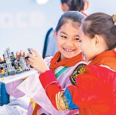 內(nèi)蒙古呼和浩特市,小學(xué)生在校學(xué)習(xí)組裝機(jī)器人。丁根厚攝(影像中國)