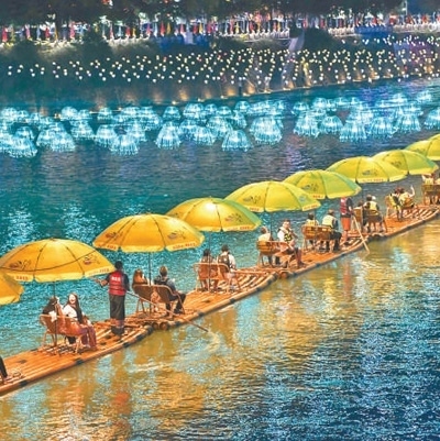 湖北宣恩縣,游客在貢水河上乘坐竹筏欣賞夜色。新華社記者 程 敏攝