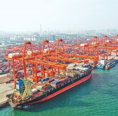 山東日照港,集裝箱碼頭正在進(jìn)行裝船作業(yè)。本報記者 陳 斌攝