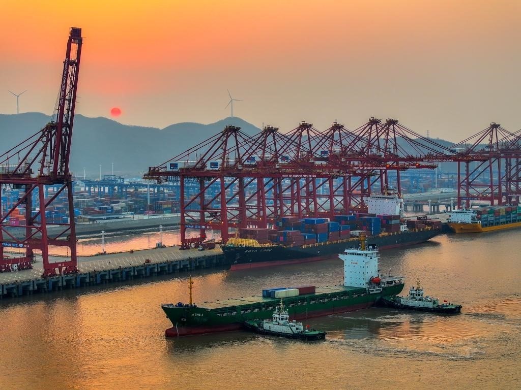 2024年2月11日,寧波舟山港金塘港區(qū)船來船往,碼頭作業(yè)繁忙(無人機照片)。新華社發(fā)(姚峰攝)