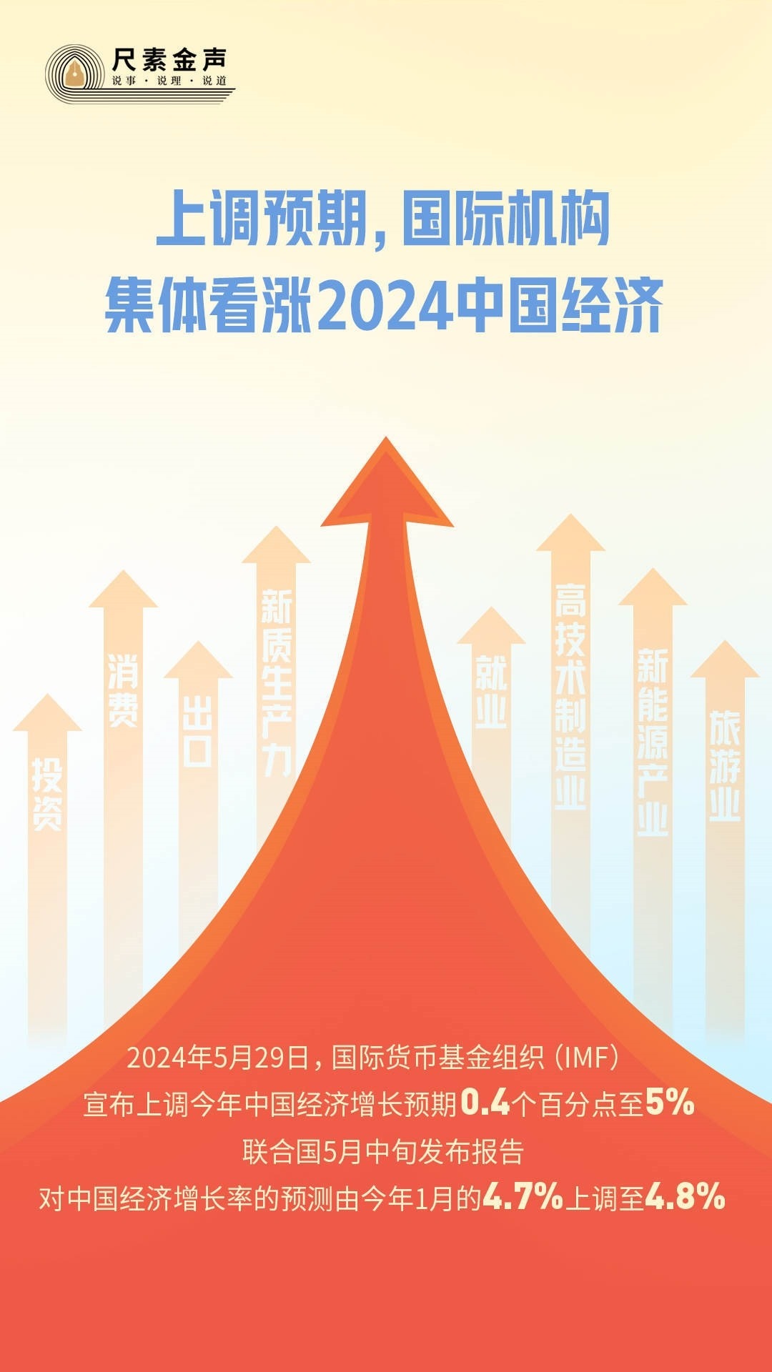 5月29日,國際貨幣基金組織(IMF)宣布上調(diào)今年中國經(jīng)濟(jì)增長預(yù)期0.4個百分點(diǎn)至5%。聯(lián)合國5月中旬發(fā)布報告,對中國經(jīng)濟(jì)增長率的預(yù)測由今年1月的4.7%上調(diào)至4.8%。4月以來,亞洲開發(fā)銀行、摩根士丹利、高盛、瑞銀等國際金融機(jī)構(gòu)紛紛上調(diào)對中國經(jīng)濟(jì)增速的全年預(yù)期。