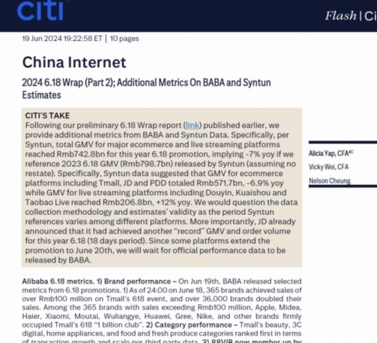 花旗引用數(shù)據(jù)指出,在天貓618活動中,有365個品牌實現(xiàn)了超過1億元人民幣的銷售額,超過3萬6千個品牌實現(xiàn)了銷售額翻番,淘寶百億補貼GMV同比增長550%。