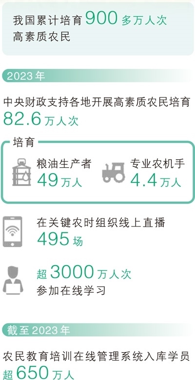 目前,我國累計(jì)培育900多萬人次高素質(zhì)農(nóng)民。嘗鮮新技術(shù)、涉足新業(yè)態(tài),一批批高素質(zhì)農(nóng)民積極擁抱專業(yè)化、規(guī)模化、標(biāo)準(zhǔn)化的現(xiàn)代經(jīng)營理念,為農(nóng)業(yè)農(nóng)村發(fā)展保持穩(wěn)中向好態(tài)勢提供了有力支撐。