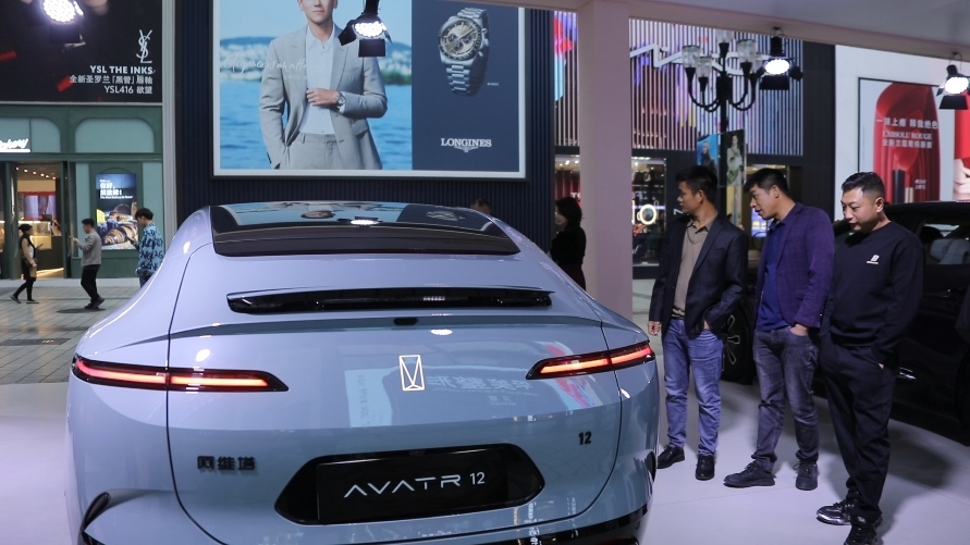 新上市的新能源汽車長安阿維塔12雙動力車型吸引往來游客。新華社記者趙小帥 攝