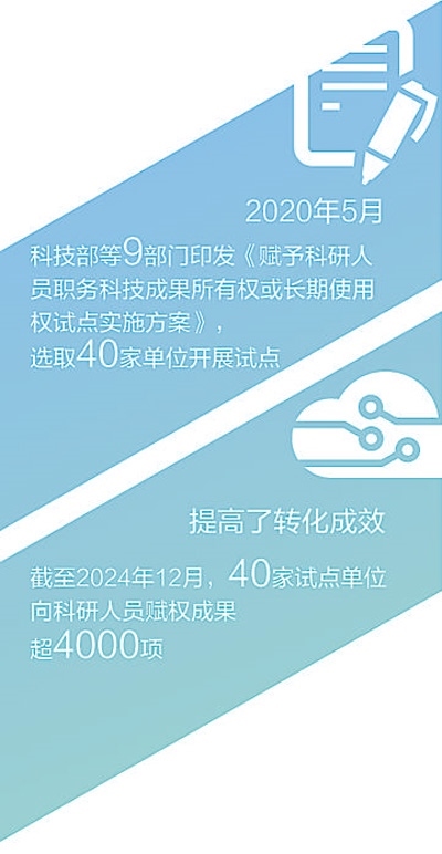 賦權試點實施以來,40家試點單位向科研人員賦權成果超4000項。2023年,以轉讓、許可、作價投資三種方式轉化科技成果合同金額達36.25億元,參與試點的科研人員普遍可獲科技成果轉化收益70%以上。僅2023年,試點單位對科研人員的現(xiàn)金股權獎勵就高達9.33億元。