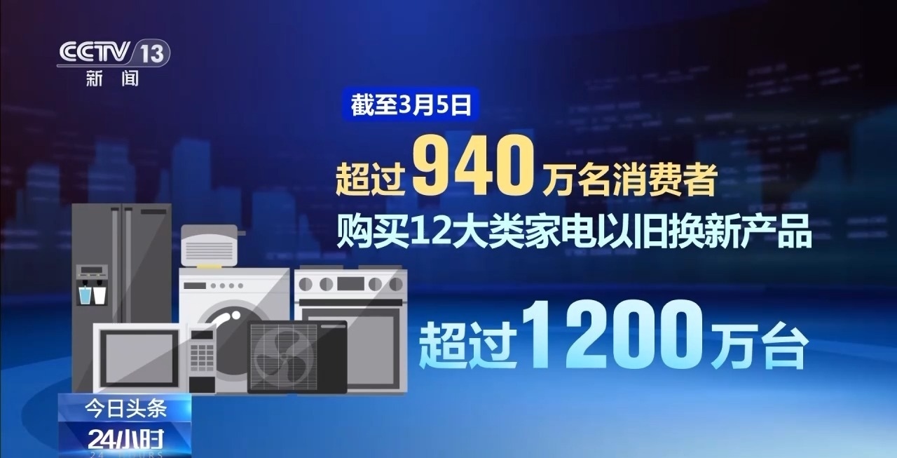 商務(wù)部數(shù)據(jù)顯示,截至3月5日,超過940萬名消費(fèi)者購買12大類家電以舊換新產(chǎn)品超過1200萬臺,已有超過3400萬名消費(fèi)者申請了超過4200萬件手機(jī)等數(shù)碼產(chǎn)品購新補(bǔ)貼。