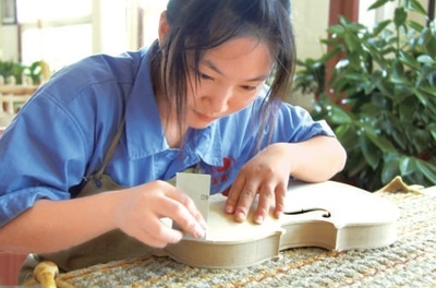 走進(jìn)華東樂器有限公司的生產(chǎn)車間,修弦枕、磨弦槽、打琴軸、上音柱、修琴碼……一道道工序正有條不紊地推進(jìn),35歲的郭增慧正熟練地組裝提琴?!皝磉@里之前,我就是一位普通的家庭主婦,干過很多份工作,音樂和提琴對(duì)我來說是很遙遠(yuǎn)的東西。”郭增慧感慨。十年前,她從河北張家口嫁到東高村鎮(zhèn)附近的三河市,靠著家里的幾畝田地,生活并不富裕。在朋友的介紹下來到提琴廠,廠里的工資可觀,按件計(jì)酬,時(shí)間機(jī)動(dòng)靈活,可以隨時(shí)照顧家庭。于是,她在這兒一干就是十幾年。
