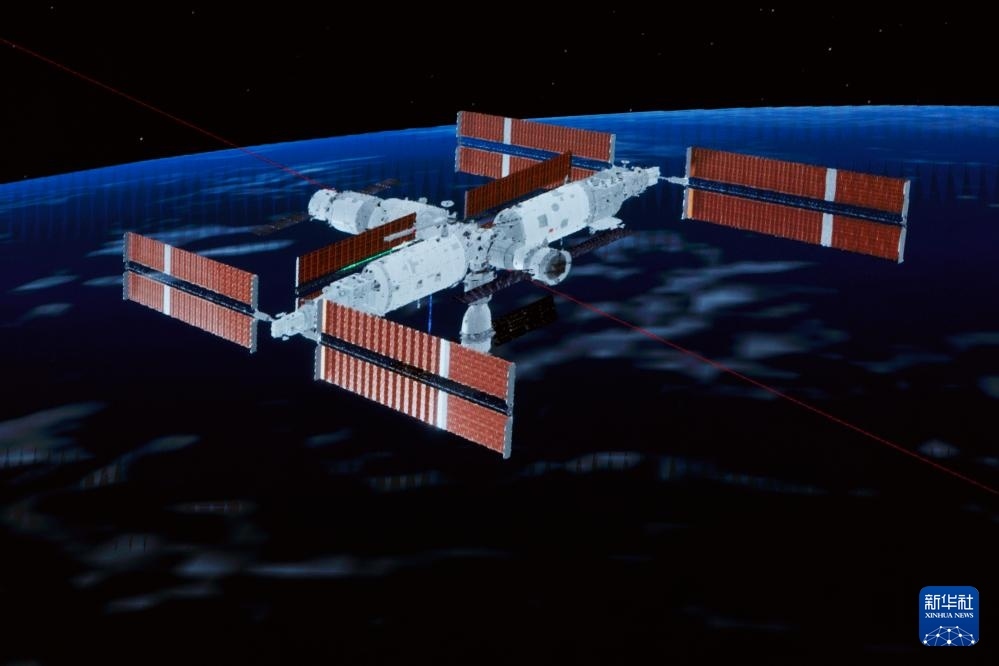 4月24日在北京航天飛行控制中心拍攝的神舟二十號載人飛船對接空間站天和核心艙過程的模擬畫面。新華社記者 金立旺 攝