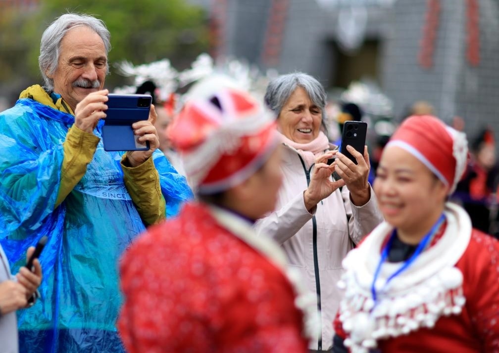4月12日,外國(guó)游客在貴州省黔東南苗族侗族自治州臺(tái)江縣舉行的“苗族姊妹節(jié)”慶祝活動(dòng)上拍攝。新華社記者劉續(xù) 攝