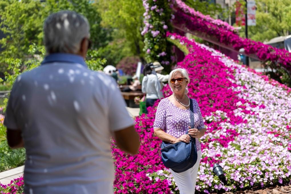 4月18日,外國(guó)游客在上海國(guó)際花展黃浦新天地主會(huì)場(chǎng)留影。新華社記者王翔 攝
