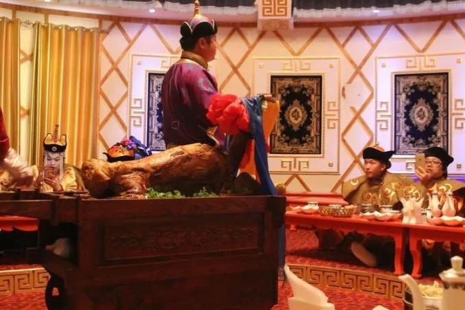 全羊宴是呼倫貝爾地區(qū)款待貴賓和祭奠及盛大節(jié)日宴會(huì)上的名貴佳肴,全羊宴色、香、味、形俱佳,別有風(fēng)味。全羊宴一般選用二歲左右肥全羯羊,其食用儀式頗為隆重,廚師先將整只羊放入大木盤(pán)中,在羊脖子上系上紅綢帶,呈給賓客觀看。有些宴席進(jìn)行開(kāi)羊儀式,還會(huì)伴有呼麥表演。