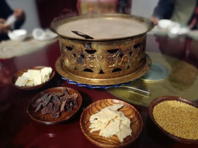 傳統(tǒng)鍋茶的制作方法是先用銅鍋將奶茶熬好,之后加入風(fēng)干肉、奶酪、奶皮子等,在鍋中邊煮邊吃。吃的時(shí)候?qū)⒛滩枋⒃谕胫?,加上奶豆腐和炒米,再和黃油混在一起。越往后,炒米和奶豆腐泡得越軟,味道口感越好。鍋茶咸咸的口味中含有濃濃的奶香,讓人回味無(wú)窮。