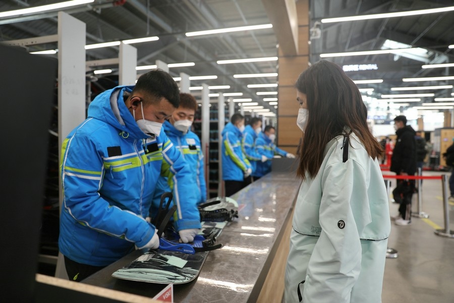 滑雪愛(ài)好者正在領(lǐng)取雪具