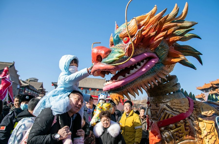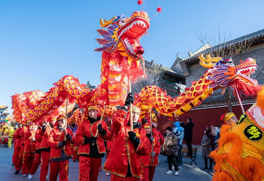 2024年2月15日,民間藝人在呼和浩特新春文化廟會現(xiàn)場進行舞龍表演。丁根厚 攝