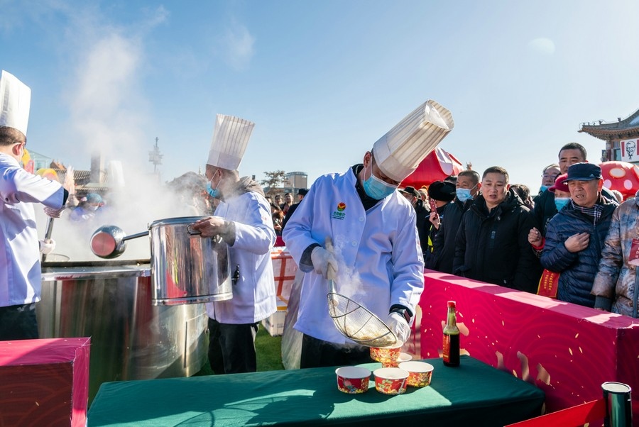 2024年2月15日,工作人員在呼和浩特市玉泉區(qū)塞上老街旅游休閑街區(qū)“千人餃子”品鑒活動現(xiàn)場為游客盛餃子。丁根厚 攝