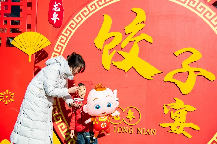 2024年2月15日,人們在呼和浩特市玉泉區(qū)塞上老街旅游休閑街區(qū)“千人餃子”品鑒活動現(xiàn)場品嘗餃子。丁根厚 攝