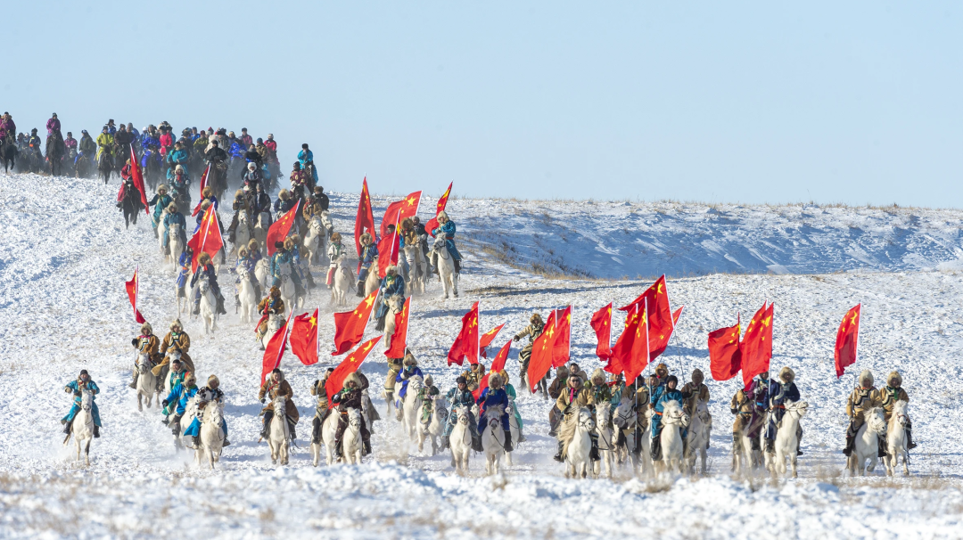 9時50分,在護旗方陣的護衛(wèi)下,鮮艷的五星紅旗冉冉升起,《義勇軍進行曲》響徹云霄,萬人肅立齊唱。方陣入場式上,200名農牧民手持火紅的辣椒、金黃的向日葵和飽滿的西瓜,用豐收的喜悅“描繪”鄉(xiāng)村振興畫卷;400名“民族大家庭”方陣成員身著五彩盛裝,恰似民族團結的斑斕錦緞;企業(yè)代表、干部職工代表、裁判、射箭手、搏克手等方陣依次入場,大家精神抖擻,昂首闊步,展現出全旗各族人民團結奮進的精神面貌;最令人心潮澎湃的當數蒙古馬方陣——百匹駿馬踏著《黑駿馬》的悠揚琴聲奔騰而來,馬蹄卷起草浪,鬃毛飛揚如旗,將北疆兒女的豪邁氣概演繹得淋漓盡致。