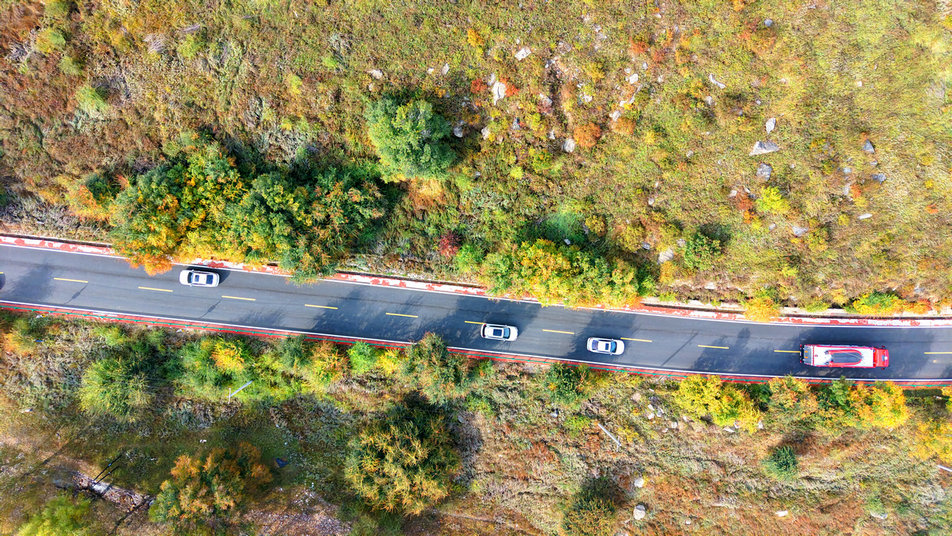 10月3日,內(nèi)蒙古大青山國(guó)家級(jí)自然保護(hù)區(qū)內(nèi),一片五彩斑斕,金色的白樺、翠綠的松柏、火紅的楓葉……山間谷底,層林盡染,吸引了大量游客自駕前來(lái)欣賞秋色。
