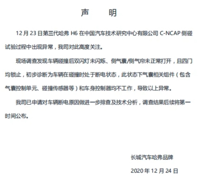 針對此碰撞結(jié)果,長城汽車給出了官方聲明,稱初步診斷為車輛在碰撞時(shí)處于斷電狀態(tài),導(dǎo)致以上異常。具體內(nèi)容如下: