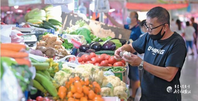 6月17日,呼和浩特市民在選購蔬菜。據(jù)全區(qū)各盟市上報自治區(qū)發(fā)改委價格監(jiān)測中心的監(jiān)測數(shù)據(jù)顯示:我區(qū)羊肉、雞肉、雞蛋、蔬菜類價格下降,牛肉價格上漲,豬肉、食用油、水產(chǎn)品價格略有升降,成品糧價格穩(wěn)中有降,豆腐、牛奶價格持平。雞蛋價格自5月上旬開始持續(xù)回落,地產(chǎn)蔬菜逐漸上市,全區(qū)蔬菜價格呈季節(jié)性下降趨勢。(內(nèi)蒙古日報社融媒體記者孟和朝魯攝)