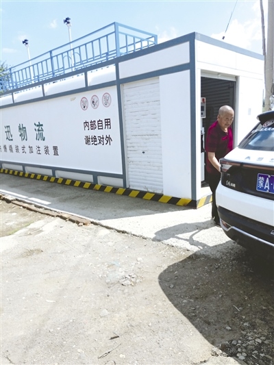 6月30日,記者來到位于遠(yuǎn)鵬星河國(guó)際小區(qū)與南二環(huán)快速路中間的一處停車場(chǎng)。一進(jìn)停車場(chǎng),就看到一個(gè)寫有“邦迅物流內(nèi)部自用謝絕對(duì)外”的撬裝式加注裝置(如圖三)。記者停下車,從旁邊的彩鋼房里走出來一位老人,向記者索要“加油卡”。記者表示,沒辦卡,是朋友介紹來的,說這里油便宜。老人看了看記者說:“那這次就先加吧,下次別忘記找熟人辦卡。卡里不用充錢,但沒卡老板不讓給加油,怕出事?!崩先苏f,他每個(gè)月的工資1800元。這個(gè)“加油站”只是臨時(shí)的,這塊地什么時(shí)候開發(fā),“加油站”就什么時(shí)候挪走。加完油后,老人亮出胸前的二維碼,很熟練地收了錢。