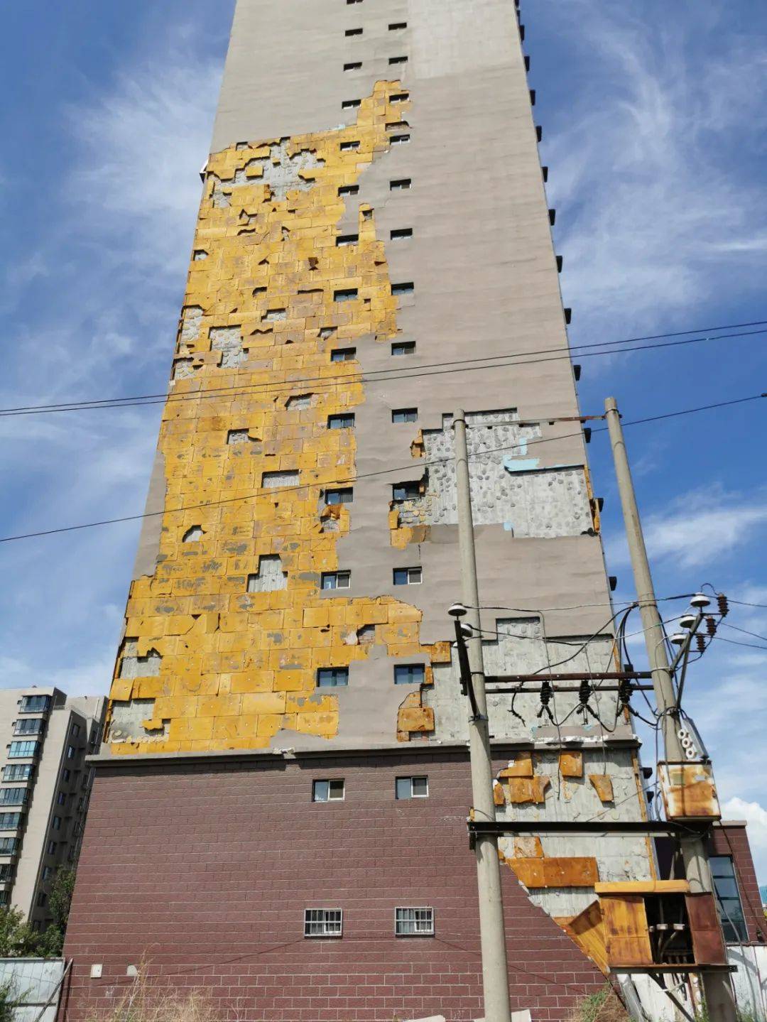 7月1日10時許,記者來到聞都雅苑4號樓下,抬頭望去,該棟樓西側墻壁有三處地方出現(xiàn)破損,大片的墻皮和里面的保溫層均已脫落。記者注意到,聞都雅苑共有4棟高層,該小區(qū)只有東西和南北兩條主干道以及西側一條小走廊,而4號樓正好位于南北主干道一側。據(jù)小區(qū)居民郝先生介紹,不斷掉落的保溫層已經(jīng)威脅到了居民的人身安全。今年5月6日,呼和浩特市出現(xiàn)大風天氣,在風力的作用下,4號樓東西兩側的外墻保溫層出現(xiàn)大面積脫落,一位恰巧路過4號樓西側的女性業(yè)主不幸被掉落的材料砸中,導致腿部受傷,此事也給小區(qū)居民帶來了恐慌。