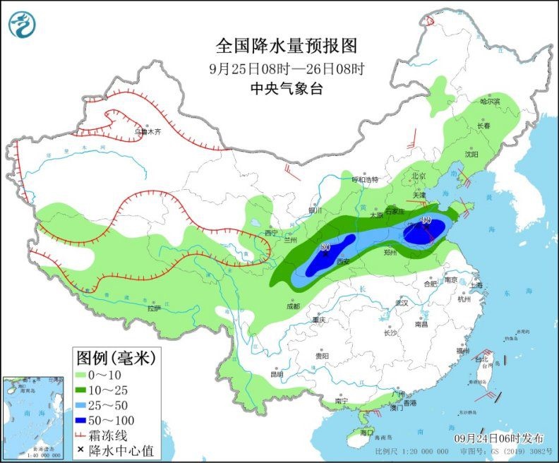 9月25日08時(shí)至26日08時(shí),西北地區(qū)東部、華北南部、黃淮大部等地部分地區(qū)有中到大雨,其中,甘肅東部、陜西中南部、山東中南部等地部分地區(qū)有暴雨(50~90毫米)。內(nèi)蒙古中西部、遼東半島等地部分地區(qū)有4~6級風(fēng)。