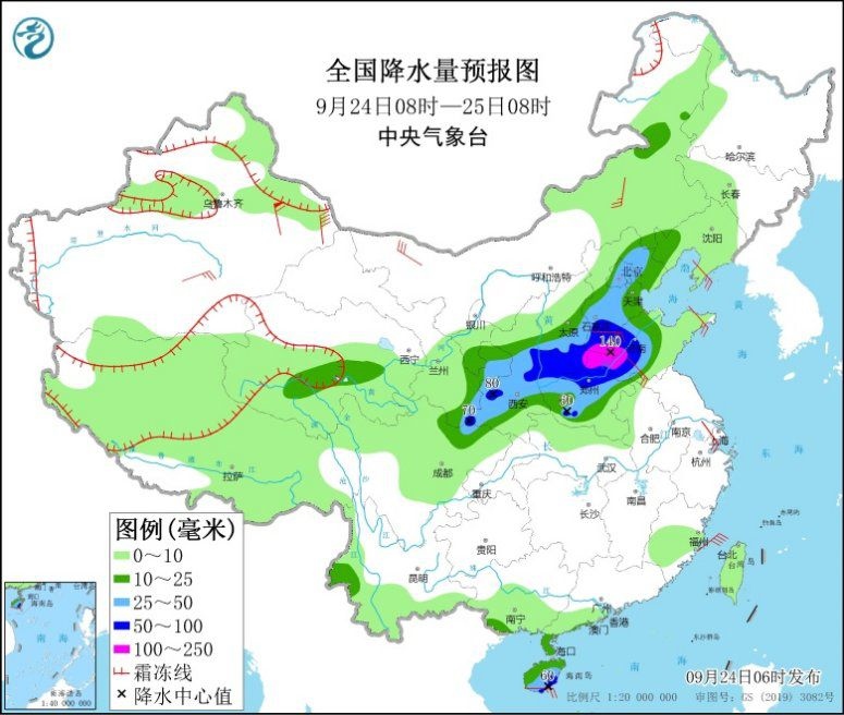 9月24日08時(shí)至25日08時(shí),西北地區(qū)東部、華北大部、黃淮中北部、海南島等地部分地區(qū)有中到大雨,其中,陜西中南部、華北南部、山東西部、河南北部、海南島東南部等地部分地區(qū)有暴雨或大暴雨(100~140毫米)。新疆南疆盆地等地部分地區(qū)有4~6級風(fēng),新疆東部部分地區(qū)有8~9級風(fēng)。